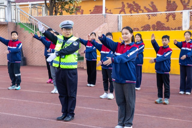 民警正在教學(xué)生們交通安全手勢(shì)。通訊員 李旭暉 攝