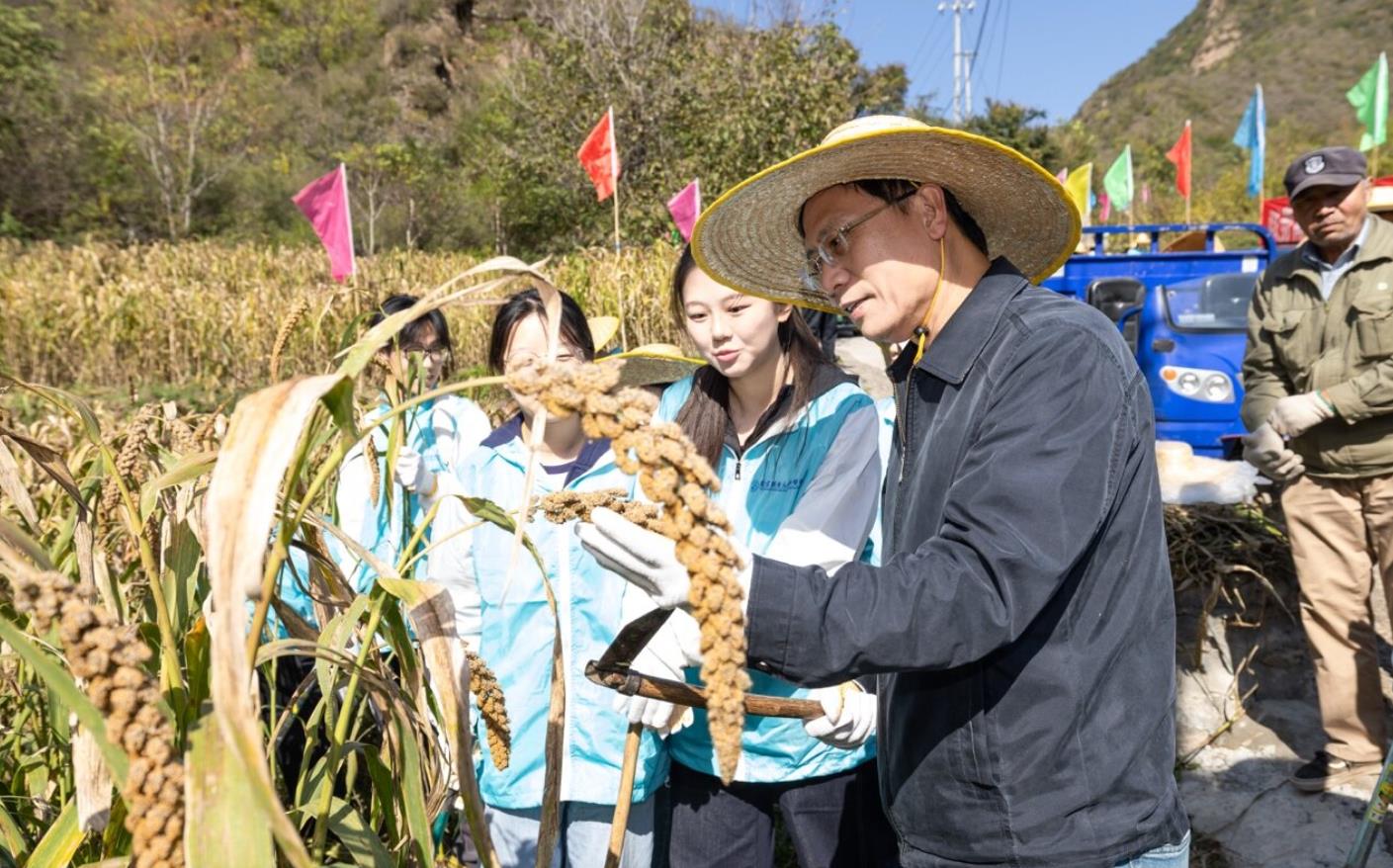 北京聯(lián)合大學(xué)黨委書記楚國清指導(dǎo)同學(xué)們?nèi)绾问崭罟茸硬⒅v授農(nóng)作物知識。學(xué)校供圖