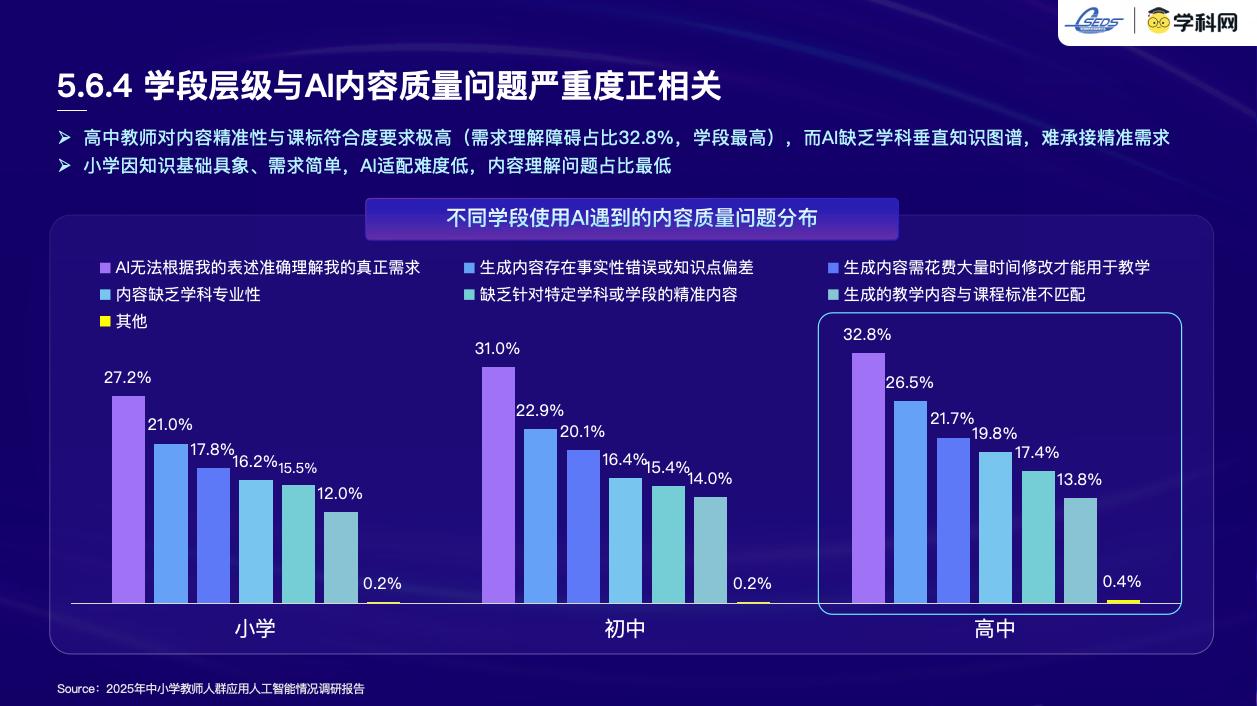 報(bào)告顯示,教師對于人工智能的應(yīng)用在學(xué)段上差異明顯,小學(xué)教師應(yīng)用場景以基礎(chǔ)教學(xué)資源獲取為主;初中教師的應(yīng)用則逐漸向應(yīng)試需求傾斜,出題組卷類工具的使用需求增加;高中教師對生成內(nèi)容的精準(zhǔn)度要求最為嚴(yán)格,對內(nèi)容專業(yè)性與準(zhǔn)確性的期待更高。