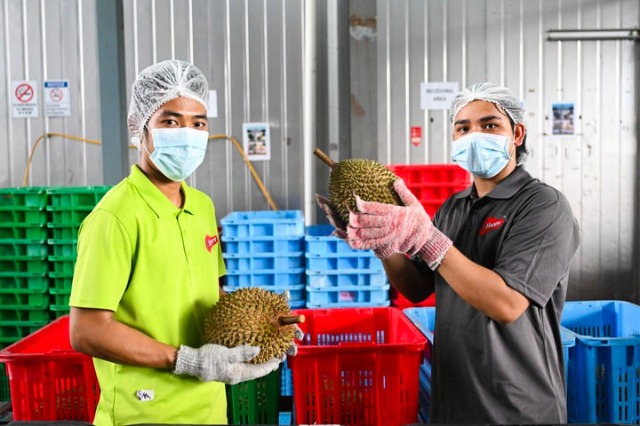 工作人員在馬來(lái)西亞雪蘭莪州的一家榴蓮加工廠檢查榴蓮(2025年10月16日攝)。馬來(lái)西亞的榴蓮從果園采摘到送到中國(guó)消費(fèi)者手中,全程最快僅需36小時(shí)。新華社記者 程一恒 攝