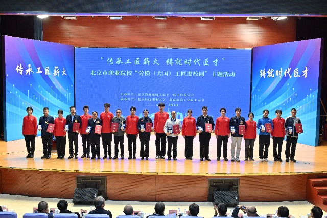 11月4日,北京市職業(yè)院?!皠谀#ù髧?guó))工匠進(jìn)校園”活動(dòng)中,10名北京科技職業(yè)大學(xué)的學(xué)生為10位勞模工匠頒發(fā)“班級(jí)工匠導(dǎo)師”聘書(shū)。北京科技職業(yè)大學(xué)供圖