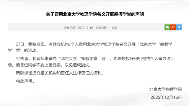 北京大學(xué):社會(huì)機(jī)構(gòu)/個(gè)人冒用其物理學(xué)院名義開展寒假學(xué)堂2025年12月16日,北京大學(xué)物理學(xué)院發(fā)布聲明,有社會(huì)機(jī)構(gòu)/個(gè)人冒用北京大學(xué)物理學(xué)院名義開展“北京大學(xué)‘寒假學(xué)堂’營(yíng)”的活動(dòng)。經(jīng)核查,北京大學(xué)物理學(xué)院從未舉辦“北京大學(xué)‘寒假學(xué)堂’營(yíng)”,也未授權(quán)任何機(jī)構(gòu)或個(gè)人舉辦該活動(dòng)。請(qǐng)各位同學(xué)不要上當(dāng)受騙,以免造成損失。