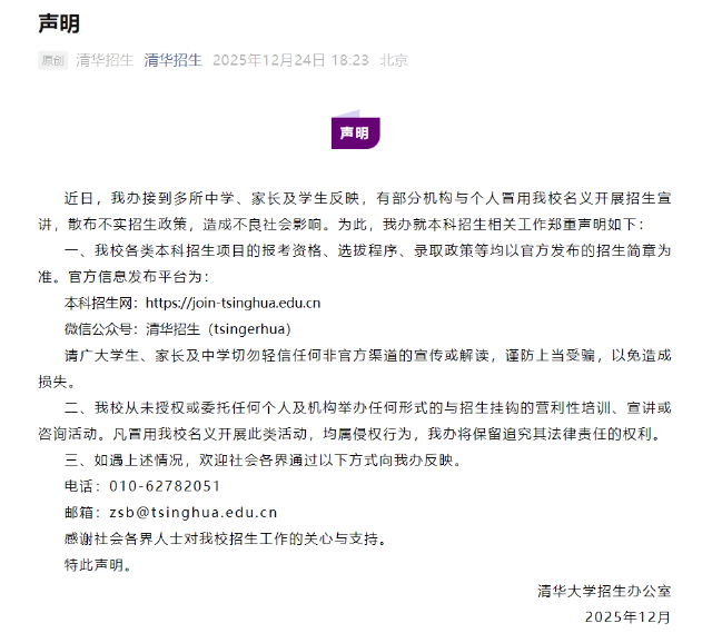 清華大學(xué):部分機(jī)構(gòu)與個(gè)人冒用學(xué)校名義開展招生宣傳2025年12月24日,清華大學(xué)招生辦發(fā)布鄭重聲明。強(qiáng)調(diào)清華大學(xué)各類本科招生項(xiàng)目的報(bào)考資格、選拔程序、錄取政策等均以官方發(fā)布的招生簡(jiǎn)章為準(zhǔn),具體需關(guān)注清華招生微信公眾號(hào)或本科招生網(wǎng)。清華大學(xué)從未授權(quán)或委托任何個(gè)人及機(jī)構(gòu)舉辦任何形式的與招生掛鉤的營(yíng)利性培訓(xùn)、宣講或咨詢活動(dòng)。