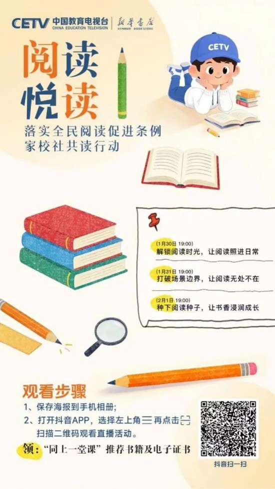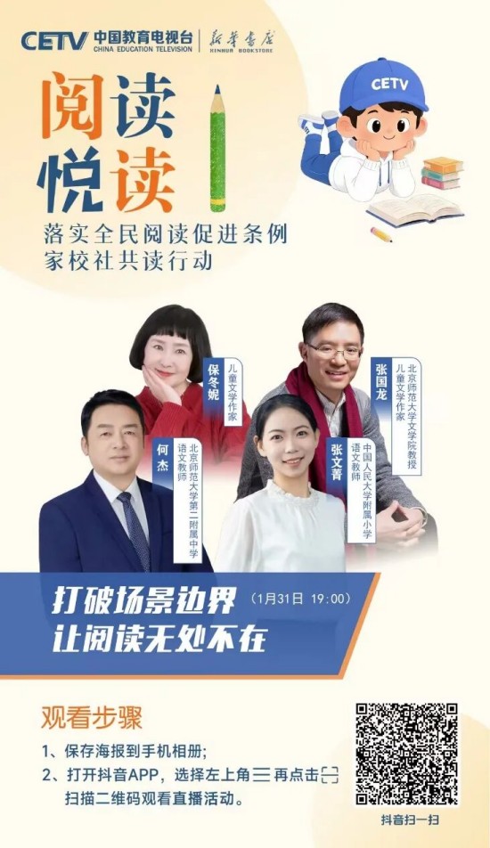 為推動條例有效落地、培養(yǎng)廣大青少年更好地閱讀,在教育部基礎(chǔ)教育司指導(dǎo)下,中國教育電視臺聯(lián)合人民教育出版社、新華書店總店,特邀閱讀推廣人、閱讀領(lǐng)誦人、閱讀分享人等,共同開啟“落實全民閱讀促進條例 家校社共讀行動”全媒體直播活動。這不僅是對條例精神的踐行,更是對“讀書破萬卷,下筆如有神”的文化傳承,是為青少年搭建與先賢對話、與自我對話、與世界對話的精神橋梁。
