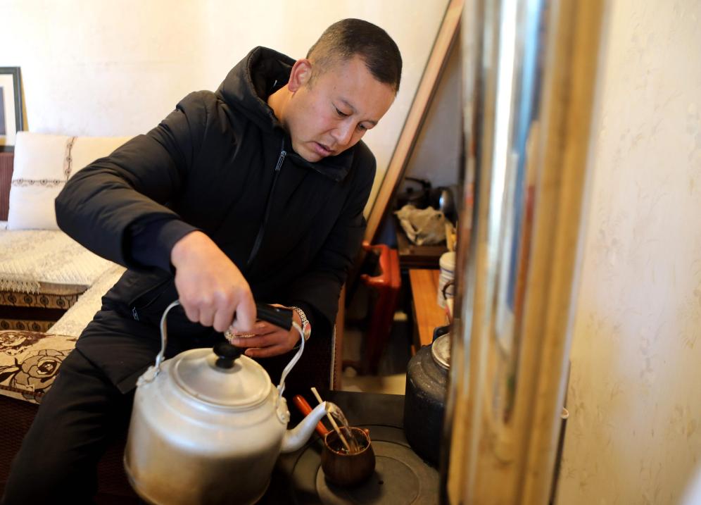 臨近中午,屋里爐子上茶水沸騰,發(fā)出“咕嘟嘟”的聲響。馬海龍回到家,掃地、擦窗。當(dāng)?shù)亓?xí)俗,農(nóng)歷小年要“掃房”,寓意辭舊迎新。