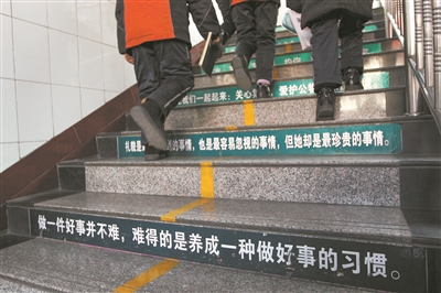 “今天你禮讓了嗎,幫助別人了嗎?”“在任何方面,每天做到進(jìn)步一點(diǎn)點(diǎn)。”……在山西省臨汾市曲沃縣實(shí)驗(yàn)小學(xué),每層樓梯的臺(tái)階下方都貼著這樣的文明行為提示語(yǔ)。
