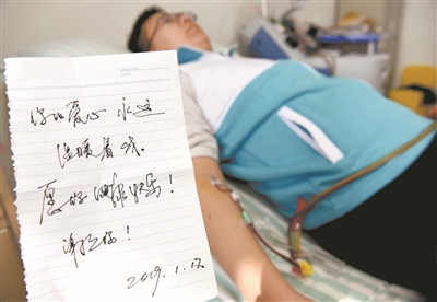 1月24日,安徽理工大學(xué)大四學(xué)生馬凱旋在合肥市中國科學(xué)技術(shù)大學(xué)附屬第一醫(yī)院成功捐獻(xiàn)造血干細(xì)胞,為四川一位患者送去了生命的希望。采集造血干細(xì)胞的近5個小時里,四川患者手寫的問候紙條就在馬凱旋的病床邊,上面寫著:你的愛心永遠(yuǎn)溫暖著我。愿你健康快樂!謝謝你! 2015年秋,從山東農(nóng)村考入安徽理工大學(xué)的馬凱旋參與了造血干細(xì)胞采樣。幾個月前,大四的馬凱旋接到淮南市紅十字會電話,毫不猶豫地答應(yīng)捐獻(xiàn)。由于采集時間無法確定,馬凱旋先后完成了期末考試和考研,搶購了1月13日返回山東鄆城老家的車票。1月11日,他接到患者病情危急需要馬上捐獻(xiàn)的通知,給父母打了電話后改簽了車票。 順利完成捐獻(xiàn)后,馬凱旋親手將含有造血干細(xì)胞的234毫升混懸液交給四川醫(yī)護(hù)人員手中,并用自己的名字祝福四川患者早日康復(fù)。