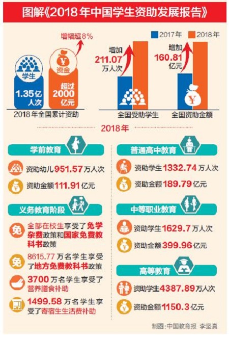 據(jù)介紹,2018年,學前教育共資助幼兒951.57萬人次,資助金額111.91億元。義務教育階段,全部在校生享受了免學雜費政策和國家免費教科書政策;8615.77萬名學生享受了地方免費教科書政策;3700萬名學生享受了營養(yǎng)膳食補助;1499.58萬名學生享受了寄宿生生活費補助。普通高中教育共資助學生1332.74萬人次,資助金額189.79億元。中等職業(yè)教育共資助學生1629.7萬人次,資助金額399.96億元。高等教育共資助學生4387.89萬人次,資助金額達1150.3億元,比上一年增加99.56億元,增幅達到9.48%。