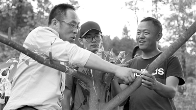 近日,浙江農(nóng)林大學(xué)星火燎原——“金果子”科技扶貧團隊,深入貴州省錦屏縣山核桃種植農(nóng)戶家中、專業(yè)合作社基地。師生們跟隨村民們爬上山地,實地考察山核桃高接換種和低產(chǎn)林改造基地,仔細(xì)分析并解決村民們在施肥、授粉、除蟲等方面存在的問題。圖為“金果子”科技扶貧團隊成員向當(dāng)?shù)卮迕駛魇谏胶颂曳N植技術(shù)。金果 攝