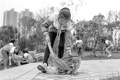 5月21日,四川省華鎣市雙河第二小學(xué)四年級(1)班的少先隊(duì)員,利用上思想品德課的機(jī)會(huì)走出校園,來到附近的城北公園清掃垃圾、撿拾落葉,爭當(dāng)“講文明、愛衛(wèi)生、護(hù)環(huán)境、我行動(dòng)”的宣傳員、示范者,以自己的行動(dòng)呵護(hù)美麗家園。邱海鷹 何健 攝
