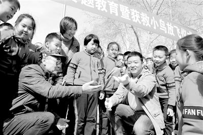 前不久,山東省青州市城區(qū)的益都師范學(xué)校附屬小學(xué)二年級王清渠、王藝瑾、王藝璇三名同學(xué)放學(xué)時遇到一只眼部受傷而無法飛行的灰喜鵲,并立即對其進行了救助。學(xué)校聯(lián)系當(dāng)?shù)赜^鳥會的工作人員,在對灰喜鵲進行一個階段的療傷后,組織全校學(xué)生一起參加了“愛鳥護鳥”專題教育暨獲救鳥兒放飛儀式,讓灰喜鵲重新飛翔。同時號召廣大師生向身邊的人主動宣講環(huán)保知識,熱愛大自然,做鳥類的好朋友。王慶和 攝