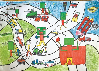 下午離園前,秋實(shí)把他的“未來世界”畫出來了,并高興地向大家介紹起來:“我夢(mèng)想的未來世界可漂亮了,有很厲害的機(jī)器人,可以幫助警察叔叔指揮交通,還可以開車帶我們出去玩。未來世界的汽車不但可以在地上跑,還可以飛起來?!?/P>