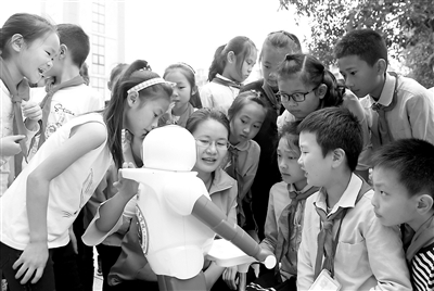 5月22日,小學(xué)生在與機(jī)器人進(jìn)行對話。當(dāng)日,以“科技強(qiáng)國·科普惠民”為主題的2019年重慶市永川區(qū)科技活動周啟動儀式在該區(qū)興龍湖小學(xué)舉行?;顒蝇F(xiàn)場,學(xué)生們饒有興趣地在機(jī)器人及智能裝備、胎兒生長發(fā)育過程、急救醫(yī)療知識、學(xué)生科技作品、無人機(jī)飛行、3D打印等區(qū)域參觀、體驗(yàn),系統(tǒng)了解科技在生活中的作用。陳仕川 攝