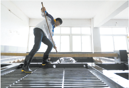 在宣城市工業(yè)學校的實訓車間,青石板砌成的水槽邊,曹紅宗的學弟學妹、宣紙工藝專業(yè)的幾名學生正忙碌著。他們兩人一組,抬著竹簾在水槽中左右晃動兩下,一張剛剛成型的濕潤宣紙便被撈了起來。
