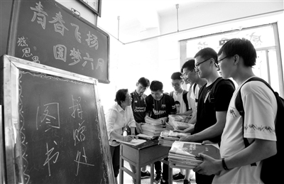 6月9日,在河北省邯鄲市第一中學(xué),高三畢業(yè)生在捐贈(zèng)書籍。