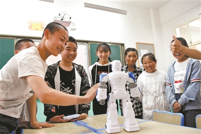7月10日,甘肅省隴南市宕昌縣官亭九年制學校學生在科普講座上觀看機器人。當日,天津大學“夢想教室”揭牌儀式暨教育扶貧物資捐贈儀式在該校舉行。來自天津大學的師生為山區(qū)學子帶來顯微鏡、機器人等并進行了現(xiàn)場教學。新華社記者 李然 攝