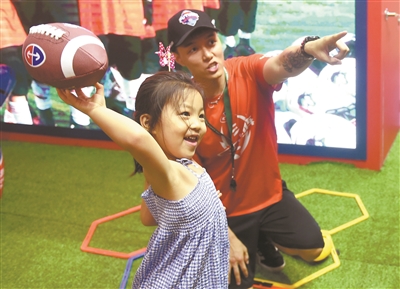 7月11日,一名小朋友在北京玩博會體驗美式橄欖球游戲。當(dāng)日,第10屆中國玩博會·北京站(簡稱北京玩博會)在全國農(nóng)業(yè)展覽館開幕,來自國內(nèi)外210多個玩具品牌的上萬款玩具參展,涵蓋拼插積木、科技智能、創(chuàng)意DIY等品類。此次玩博會將持續(xù)至7月14日。