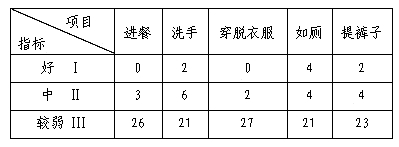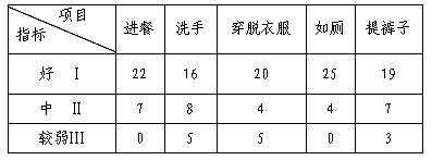 我們采用了行為研究法、家長調(diào)查問卷等方法,對半日?。?)班29名幼兒初入園時生活自理能力的各項指標進行了評價。以進餐、洗手等5項最基本的自我服務(wù)內(nèi)容為評價項目,以“在成人幫助與提示下能夠獨立完成”(好Ⅰ)“能夠獨立完成,但完成有困難”(中Ⅱ)和“完全無法獨立完成”(較弱Ⅲ)為評價指標進行評價,結(jié)果如表1。