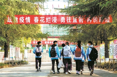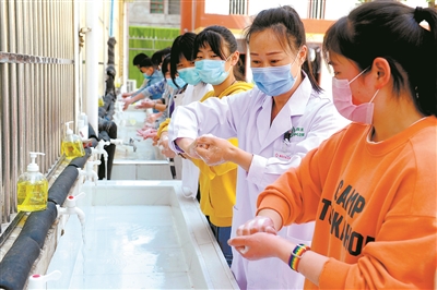復(fù)課機(jī)會,來之不易。每一張安靜的書桌背后,都凝聚著許多人的付出和汗水。校園隨處可見鼓舞學(xué)生士氣的勵志橫幅,地面醒目位置粘貼保持距離的溫馨提示,校長、教師及志愿者們變身為“防疫員”“安檢員”,安排錯時上下學(xué),按時清潔消殺校園,督促指導(dǎo)學(xué)生勤洗手,用愛溫暖守護(hù)學(xué)生。