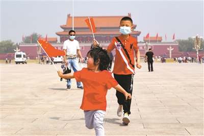 5月1日,北京市東城區(qū)天壇東里小學(xué)四(1)班學(xué)生余濤(右一)和妹妹跟隨家長(zhǎng)來(lái)到天安門廣場(chǎng)游玩。余濤的媽媽說(shuō),北京突發(fā)公共衛(wèi)生事件應(yīng)急響應(yīng)級(jí)別已下調(diào)到二級(jí),所以選擇在節(jié)日里帶孩子來(lái)天安門看國(guó)旗。本報(bào)記者 鮑效農(nóng) 攝