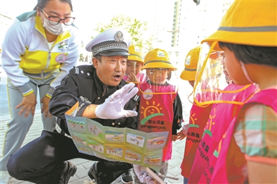 日前,河南省靈寶市陽光雨露幼兒園的孩子們,在教師和家長的帶領下來到執(zhí)勤的交警叔叔崗位前,聽交警叔叔講解交通知識。趙華 攝