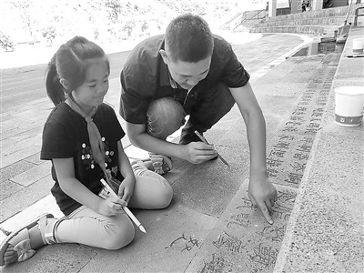 吱吱吱……烈日之下,許玉輝手持電磨機(jī)在學(xué)校操場(chǎng)旁的石階上專心雕刻著,旁邊的吳冬娜從礦泉水桶中接水給機(jī)器和石磚降溫,石階上均勻分布著一個(gè)個(gè)正楷漢字。