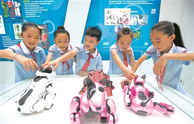 近日,江蘇省海安市城南實(shí)驗(yàn)小學(xué)東校區(qū)的學(xué)生在參觀了解“機(jī)器狗”。當(dāng)日,該校組織學(xué)生前往海安機(jī)器人及智能制造科技展館參觀,通過(guò)參觀和動(dòng)手實(shí)踐了解科學(xué)知識(shí),樂(lè)享暑假生活。