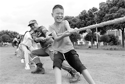 近日,在湖南省永州市道縣壽雁鎮(zhèn)第一小學(xué),學(xué)生和志愿者在素質(zhì)拓展課上拔河。連日來,道縣在6所學(xué)校和社區(qū)開展“七彩暑假·情暖童心”志愿服務(wù)活動,通過學(xué)業(yè)輔導(dǎo)、素質(zhì)拓展、安全教育和心理輔導(dǎo)等方式關(guān)愛留守兒童,陪伴他們度過充實(shí)、快樂的假期。