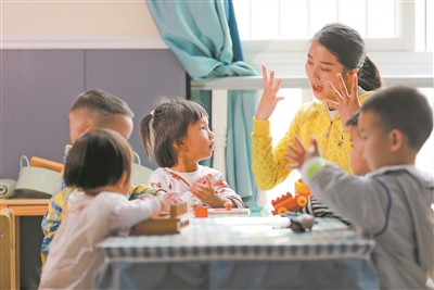 2019年以來,貴州省黔西市不斷落實(shí)生育政策和人口工作,遵循0—3歲嬰幼兒發(fā)展特點(diǎn)和規(guī)律,在人口密集的社區(qū)開辦托育點(diǎn),對(duì)嬰幼兒進(jìn)行科學(xué)早教。同時(shí),定期舉辦家長(zhǎng)輔導(dǎo)班,更新家長(zhǎng)育兒理念,促進(jìn)嬰幼兒身心健康成長(zhǎng)。圖為蓮城社區(qū)托育中心的幼兒和教師一起做手指操。