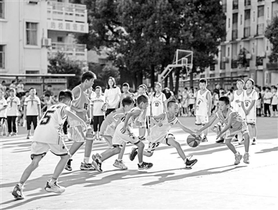 貴州省黔東南苗族侗族自治州凱里市第四小學(xué)學(xué)生在進(jìn)行籃球比賽。 蔡興文 攝
