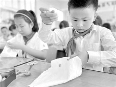 學(xué)生參加學(xué)校勞動(dòng)技能大賽之釘紐扣。 煙臺(tái)市芝罘區(qū)魯峰小學(xué)供圖