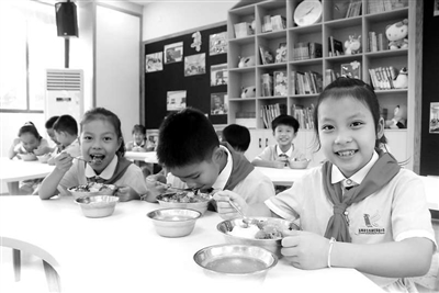 玉林市玉東新區(qū)實(shí)驗(yàn)小學(xué)三年級(jí)學(xué)生在教室用中餐。玉林市教育局供圖