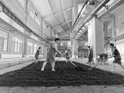 ④學生翻拌攤晾酒糟。 學校供圖