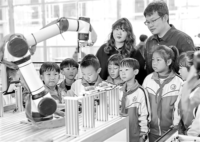 近日,河北省秦皇島市海港區(qū)交建里小學(xué)聯(lián)合燕山大學(xué)工程訓(xùn)練中心舉辦“學(xué)習(xí)科普知識(shí) 感受智能制造”活動(dòng),讓學(xué)生感受智能制造的魅力和科技發(fā)展成就,培養(yǎng)學(xué)生的科學(xué)精神。圖為工作人員為學(xué)生介紹智能化打標(biāo)檢測與裝配系統(tǒng)。 曹建雄 攝