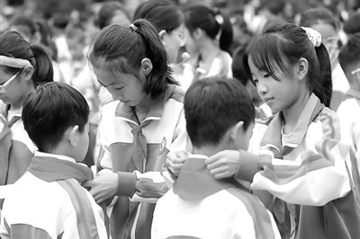 ①山東省高密市恒濤實(shí)驗(yàn)小學(xué)少先隊(duì)老隊(duì)員為新隊(duì)員佩戴紅領(lǐng)巾。 通訊員 李海濤 攝