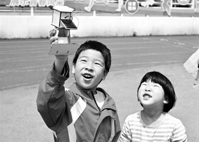 ①一對小兄妹測試太陽能衛(wèi)星模型。