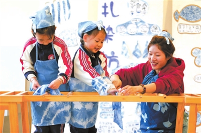 11月19日,四川省樂山市實(shí)驗(yàn)幼兒園至樂分園教師在指導(dǎo)孩子們晾曬自己的扎染作品。世界兒童日(11月20日)來臨之際,該幼兒園開展“樂學(xué)扎染 感受非遺”活動(dòng),教師指導(dǎo)孩子們體驗(yàn)扎染制作技藝,感受中華優(yōu)秀傳統(tǒng)文化的魅力。