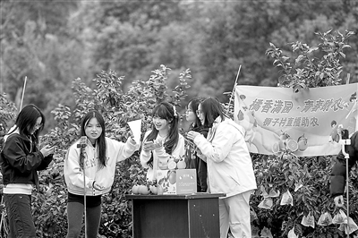 在四川眉山天府新區(qū)青龍街道獅子村,四川大學錦江學院的學生正在通過直播推銷柑橘。翁光建 攝