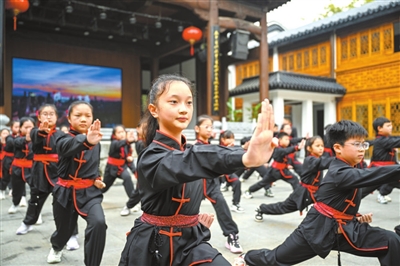 近日,安徽省合肥市廬陽區(qū)雙崗街道虹橋小學(xué)學(xué)生正在進(jìn)行傳統(tǒng)武術(shù)操展演。趙明 攝