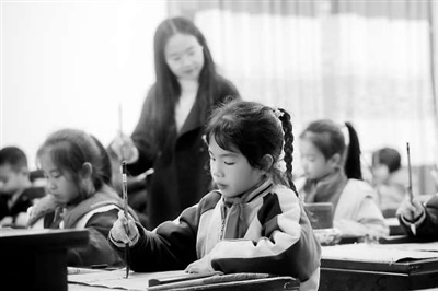 在湖南省懷化市通道侗族自治縣禮雅小學(xué),毛筆興趣班的孩子們?cè)诰毩?xí)毛筆字。李尚引 攝