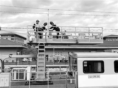吉林鐵道職業(yè)技術(shù)大學(xué)鐵道供電技術(shù)專業(yè)學(xué)生在接觸網(wǎng)檢修作業(yè)車(chē)的檢修平臺(tái)上進(jìn)行更換整體吊弦作業(yè)。