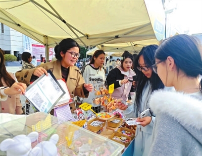走在創(chuàng)業(yè)街區(qū),日用品、美食、手作、3D打印潮玩等貨品琳瑯滿目,叫賣聲、歡笑聲、討價(jià)還價(jià)聲此起彼伏?!拔覀兦捌谧隽耸袌?chǎng)調(diào)研,發(fā)現(xiàn)身邊的同齡人都比較喜歡飾品和玩偶,同時(shí)結(jié)合隨機(jī)抽選機(jī)制滿足消費(fèi)者追求新奇體驗(yàn)的心理,推出了這個(gè)‘盲刮’項(xiàng)目,銷售勢(shì)頭很不錯(cuò)?!闭憬ど搪氃河耙晫I(yè)學(xué)生庹晶晶很高興,在她和眾多“出攤”的學(xué)生團(tuán)隊(duì)看來(lái),參與商品展銷會(huì),能夠親身體驗(yàn)從商品選型、采購(gòu)、定價(jià)到銷售策略的市場(chǎng)運(yùn)作全過(guò)程。