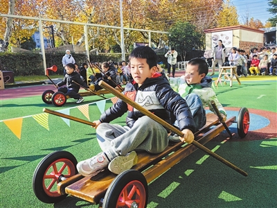 日前,浙江省杭州市蕭山區(qū)城廂幼兒園舉辦了第17屆運(yùn)動節(jié)。教師和孩子們將傳統(tǒng)運(yùn)動節(jié)變成了“項(xiàng)目化學(xué)習(xí)”大課堂。在這里,孩子們不只是運(yùn)動員,更是賽場設(shè)計(jì)師、規(guī)則創(chuàng)造者、問題解決家,他們將運(yùn)動演變?yōu)橐粓鋈诤咸骄?、協(xié)作與創(chuàng)造的綜合成長體驗(yàn)。圖為大班幼兒合作進(jìn)行劃龍舟比賽。 沈建紅 攝