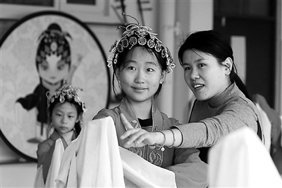①山東濰坊高密市崇實小學的學生在戲曲老師的指導下練習茂腔。