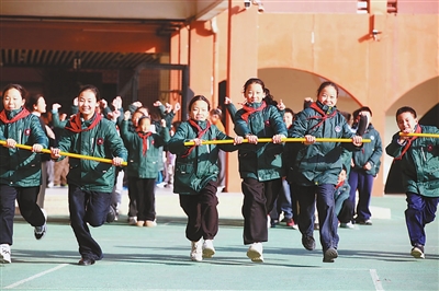 1月15日,江蘇省徐州市鼓樓小學(xué)學(xué)生在大課間參加推桿跑活動(dòng)。該校根據(jù)季節(jié)特點(diǎn),開展跳繩、推桿跑等適合學(xué)生冬季運(yùn)動(dòng)的大課間活動(dòng),引導(dǎo)學(xué)生走出教室進(jìn)行體育鍛煉,享受運(yùn)動(dòng)帶來(lái)的快樂。蒯創(chuàng) 攝