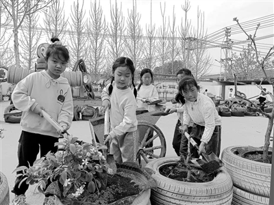 河南省濟源市梨林鎮(zhèn)梨林小學學生在廢輪胎里植綠。資料圖片