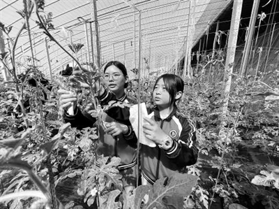 鄭州經(jīng)開區(qū)黃店一中的學生在為西瓜修剪枝蔓。資料圖片