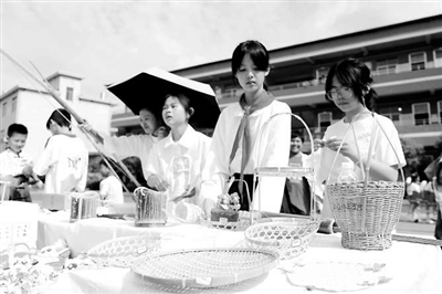 ②江西省蓮花縣花塘小學(xué)學(xué)生在校園集市上展示竹編作品。