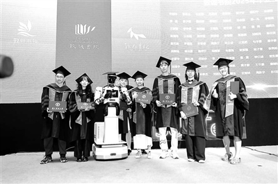①南方科技大學(xué)自主研發(fā)的人形機(jī)器人“南科盤古”在畢業(yè)典禮上與學(xué)生們互動。 學(xué)校供圖