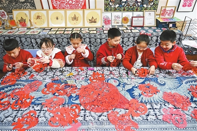 ▲2月3日,學(xué)生在貴州省貴陽市省府路小學(xué)創(chuàng)作馬年主題剪紙作品。